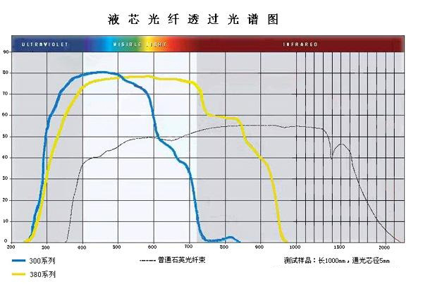 根據(jù)芯料的不同,液芯光纖可分為300和380系列,GX360系列的有效傳光范圍為300 nm~600nm,GX380系列的有效傳光范圍為300 nm~800nm。