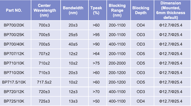 帶通濾光片波長范圍:700nm-725nm