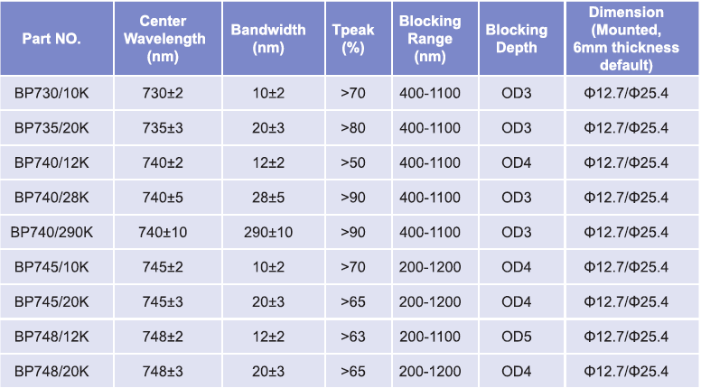 帶通濾光片波長范圍:730nm-748nm