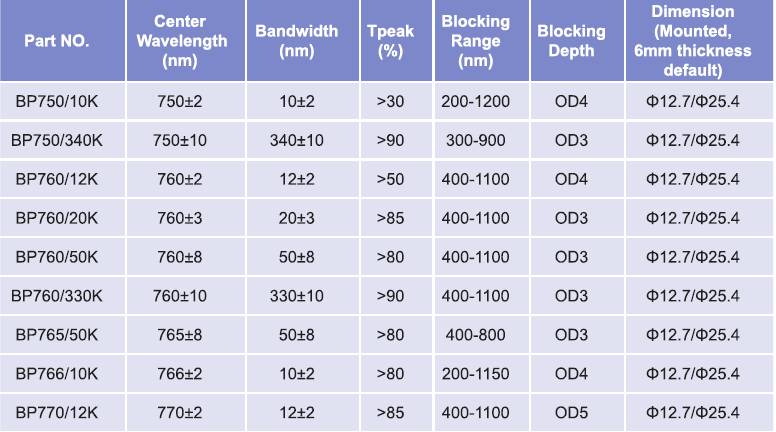 帶通濾光片波長范圍:750nm-770nm
