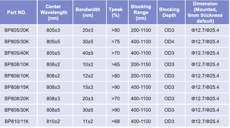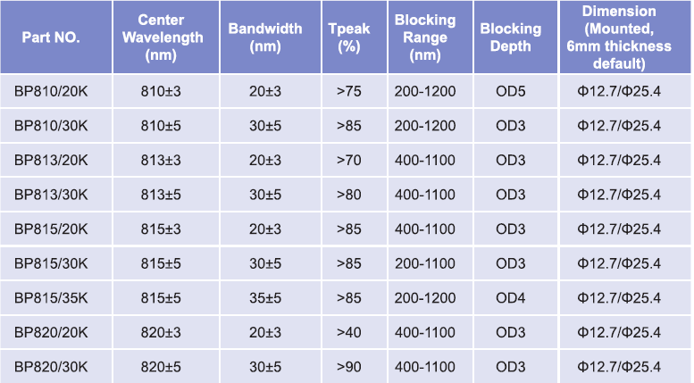 帶通濾光片波長(zhǎng)范圍:800nm-810nm