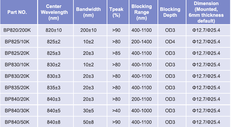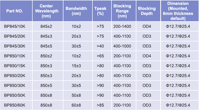 帶通濾光片波長(zhǎng)范圍:845nm-850nm