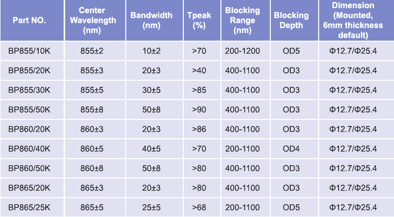 帶通濾光片波長(zhǎng)范圍:855nm-865nm