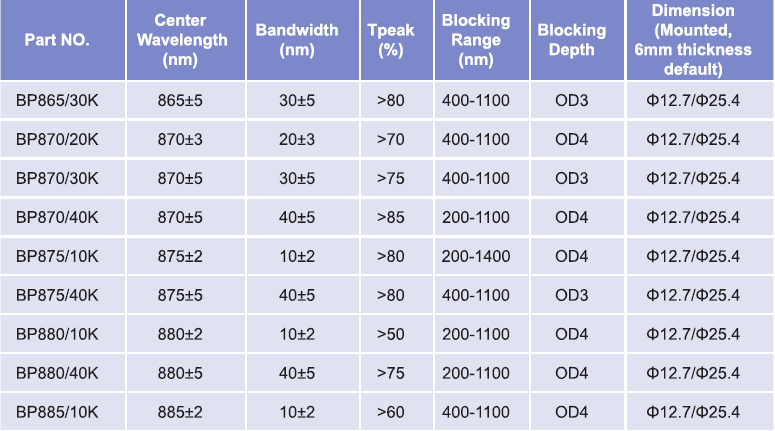 帶通濾光片波長(zhǎng)范圍:865nm-885nm