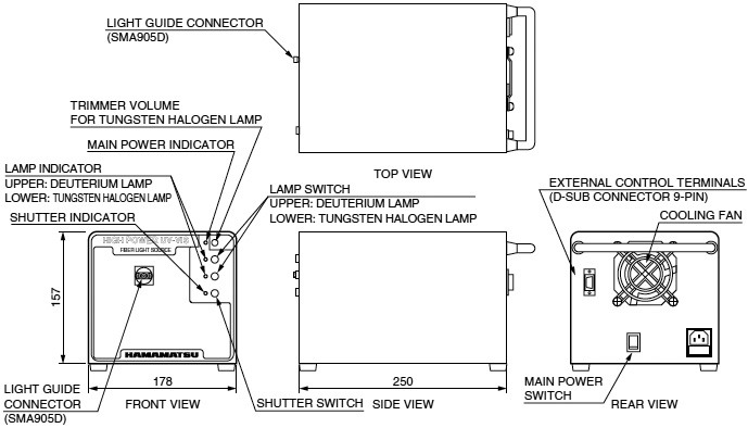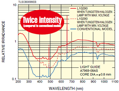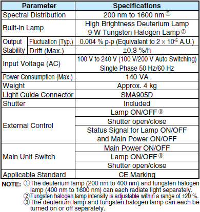 通過使用安裝在同一外殼內(nèi)的高亮度氘燈和鹵鎢燈,該光源能通過光波導(單賣)輸出200nm到1600nm的光。輸出的光強大約是現(xiàn)有型號的兩倍。緊湊的尺寸和較輕的重量使其易于攜帶。機械快門和外部控制等實用的功能使其易于使用。這種新型光源同時適用于多種型號的便攜式設(shè)備。