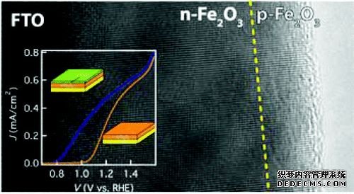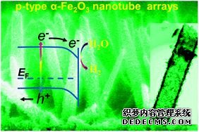 中科院理化所師文生課題組在具有ZnO陣列的FTO上,用電沉積的方式制備了FeOOH,通過高溫離子擴(kuò)散的方式使Zn2+摻雜入Fe2O3, 后去除ZnO模板獲得了p型Zn2+摻雜Fe2O3的空心納米管光陰,并展現(xiàn)出了較高的開啟電勢。(上圖,DOI:10.1039/C3CC40599K)