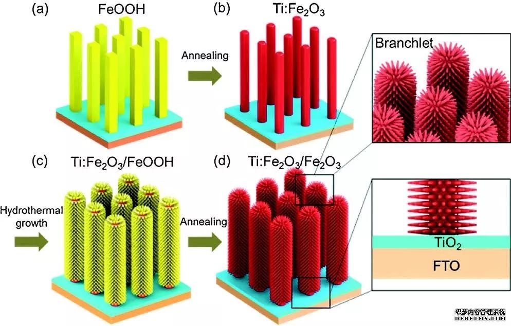 但是,F(xiàn)e2O3同時也存在著吸光系數(shù)差、光生空穴傳輸距離短(2~4 nm) 等限制因素,導(dǎo)致了目前基于Fe2O3光陽的光電轉(zhuǎn)化效率依舊較低。由于Fe2O3的空穴傳輸距離太短,因此對Fe2O3的微納結(jié)構(gòu)調(diào)控顯得尤其重要。