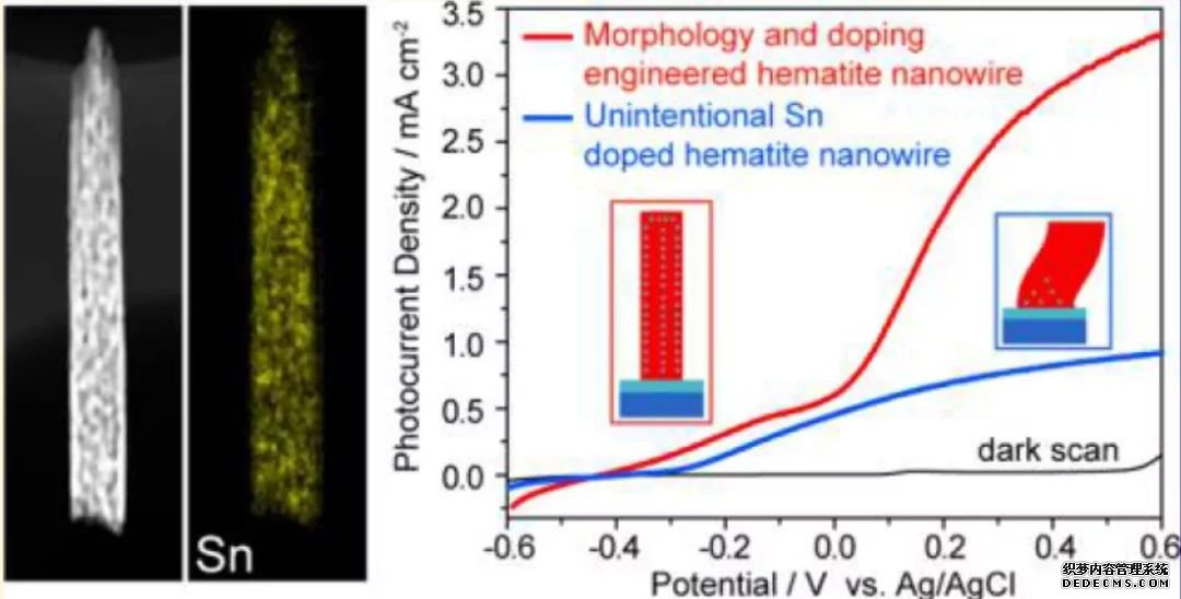 Alan Kleiman-Shwarsctein課題組制備了Pt4+摻 雜的Fe2O3,盡管Pt4+能夠提高Fe2O3光電流,但是如果摻雜濃度過高,則會減小Fe2O3電的空間電荷層,導(dǎo)致嚴(yán)重的電子空穴復(fù)合。(DOI:10.1021/cm800144q)