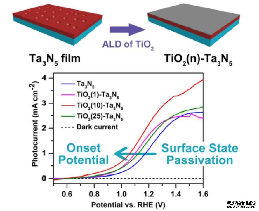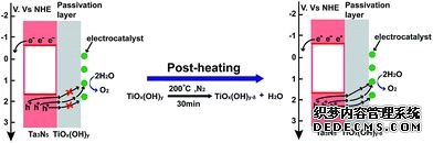 在對TiO2鈍化層的研究中,羅文俊課題組通過化學(xué)浴沉積的方法在Ta3N5上制備了一層TiO2,并且發(fā)現(xiàn)水溶液法制備的TiO2中含有的羥基基團(tuán)會影響電的性能。