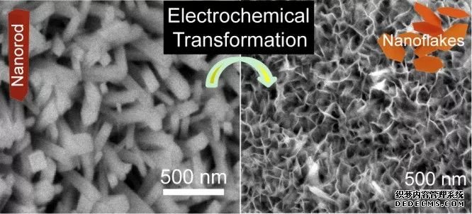 Yat Li課題組通過對Fe2O3納米棒進(jìn)行電化學(xué)誘導(dǎo),生成了約10 nm 厚的納米片狀Fe2O3,其光電流也提高了3倍。(上圖,DOI:10.1016/j.nanoen.2014.12.023)