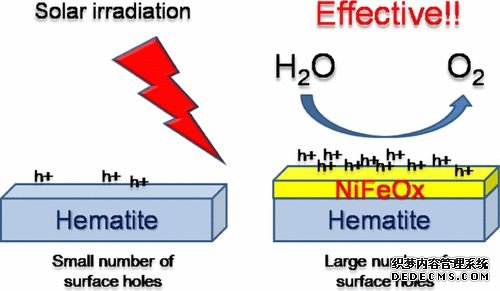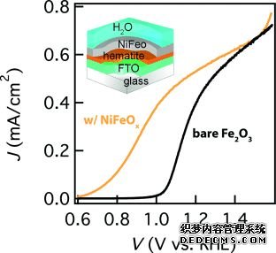 但目前在Fe2O3上降低開啟電勢有效的催化劑為NiFeOx。關(guān)于Fe2O3的開啟電勢差,Dunwei Wang課題組認(rèn)為是由于Fe2O3大量的表面態(tài)導(dǎo)致費米能級釘扎,通過NiFeOx助催化劑的引入,大程度降低了表面費米能級的釘扎效應(yīng),因此獲得了較好的開啟電勢。(上圖,DOI:10.1002/anie.201306263)