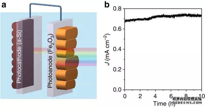 Dunwei Wang課題組發(fā)表在Nature Communications的一篇工作中,在通過Fe2O3光陽和非晶Si光陰組成的器件,獲得了當(dāng)時高約0.9%的太陽能轉(zhuǎn)化效率;(上圖,DOI:10.1038/ncomms8447)