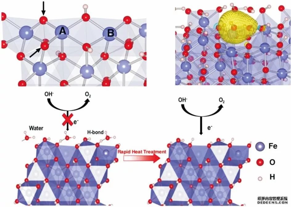 羅文俊課題組發(fā)現(xiàn)通過高溫短時間煅燒除去α-FeOOH 表面吸附水的方法,可以提高α-FeOOH 的產(chǎn)氧活性和穩(wěn)定性,通過理論計算發(fā)現(xiàn),表面吸附水會與FeOOH 表面的O形成強(qiáng)的氫鍵,影響活性位點對OH- 的吸附和氧化,從而影響了其產(chǎn)氧的活性。 (DOI:10.1039/C6TA08719A)