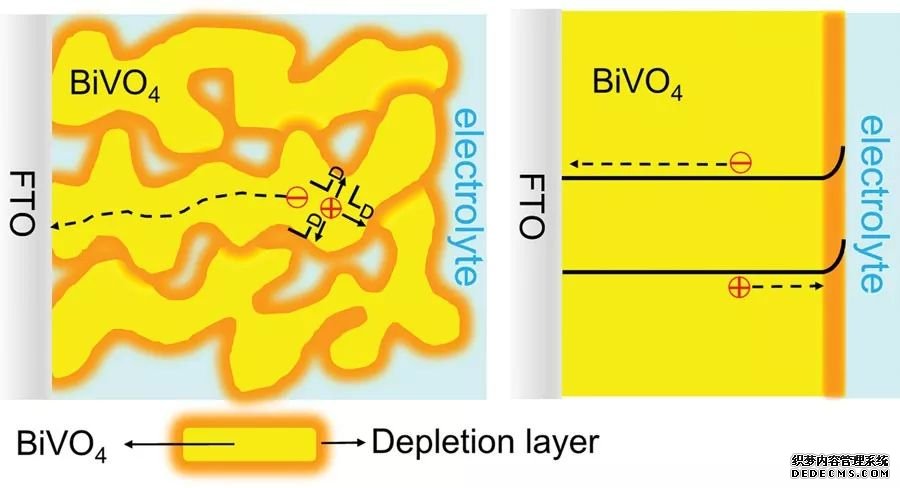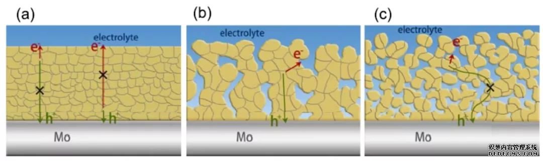 多孔結(jié)構(gòu)的BiVO4電由于減少了反射和透射,對光的吸收要高于平板結(jié)構(gòu)電。 此外,多孔結(jié)構(gòu)減少了光生空穴的傳輸距離,提高了光生載流子的分離效率,使光電流相比于致密電有了明顯的提高。但多孔結(jié)構(gòu)的光電也不是孔越多越好。 (上圖,DOI:10.1002/aenm.201301785)