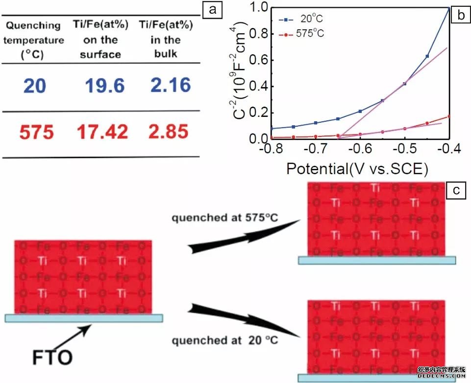 除了在材料制備后對表面偏析相進(jìn)行處理外,黃維院士團(tuán)隊對Fe2O3的煅燒過程進(jìn)行改進(jìn),發(fā)現(xiàn)通過短時間淬火的方式,能夠在制備過程中就降低表面的偏析、提高體相摻雜濃度,從而提高Fe2O3電的性能。XPS表征發(fā)現(xiàn),通過短時間高溫淬火可以有效降低Fe2O3表面的Ti偏析, 莫特肖特基曲線也發(fā)現(xiàn)高溫淬火后的載流子濃度相比于 常溫取出的Fe2O3高了6 倍,因此他們認(rèn)為高 溫淬火的方式可以將摻雜離子固定在材料晶格內(nèi)部,防止向表面偏析,從而減小表面復(fù)合,提高材料光電化學(xué)性能。(上圖,DOI:10.1002/cnma.201600108)