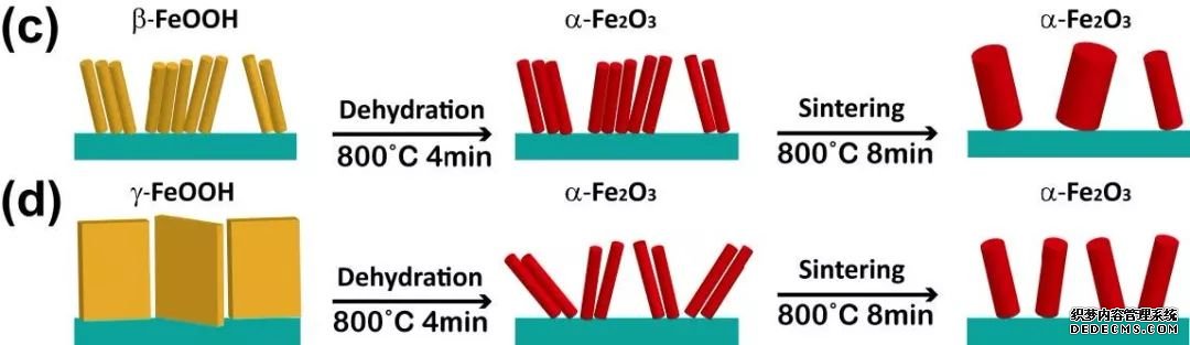 Yilin Liu等發(fā)現(xiàn) FeOOH的晶相結(jié)構(gòu)會對煅燒過程有影響:當(dāng)FeOOH 為緊密堆積的β相時,煅燒過程中納米棒會燒結(jié),終得到的Fe2O3納米棒會比較粗(約65nm);而當(dāng)FeOOH為層狀結(jié)構(gòu)的γ相時,煅燒過程中結(jié)構(gòu)會脫水?dāng)嗔眩苌沙?xì)結(jié)構(gòu)的納米棒(約20 nm) ,其光電流相比于直徑較粗的Fe2O3,也有了1.5 倍的提升。(上圖,DOI:10.1088/1361-6463/aa6fb7)
