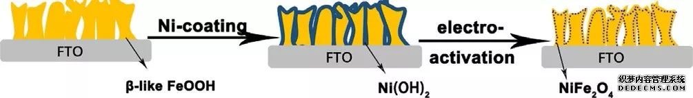 隨后他們制備了亞穩(wěn)態(tài)、大孔道結(jié)構(gòu)的類β相( schwertmannite) FeOOH 薄膜電,并且在其表面負(fù)載了少量 Ni(OH)2。在外加偏壓下,覆蓋在亞穩(wěn)態(tài)類β相FeOOH表面的Ni2+會以某種離子或離子團(tuán)的形式進(jìn)入到類β相 FeOOH 的結(jié)構(gòu)孔道,與孔道周邊的Fe原子成鍵形成 NiFe2O4,使得雙層催化劑的產(chǎn)氧活性和穩(wěn)定性都大幅提升。α-FeOOH的晶型結(jié)構(gòu)穩(wěn)定,沒有大孔道。因此在外加偏壓下,α-FeOOH/Ni(OH)2并沒有展現(xiàn)出特殊的變化,僅是單純性能的疊加,產(chǎn)氧活性也小于β-FeOOH/Ni(OH)2。因此,在FeOOH、NiOOH雙層電催化劑中,F(xiàn)eOOH 的晶相對Fe/Ni 雙層結(jié)構(gòu)催化劑的性能有較大影響。(DOI:10.1002/asia.201700964)