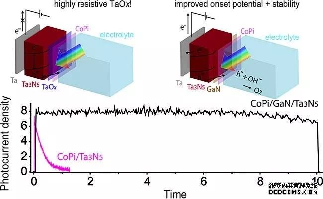 Kazunari Domen教授課題組在Angew發(fā)表的一篇文章中,通過在Ta3N5表面引入GaN 鈍化層,使原本 在1 h 時光電流就幾乎衰減為零的Ta3N5電的穩(wěn)定性提 高到了12 h 以上幾乎沒有太大衰減,并且其法拉第效率保持100%。(上圖,DOI:10.1002/anie.201700117)