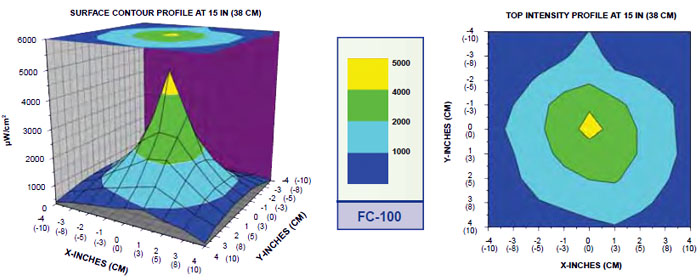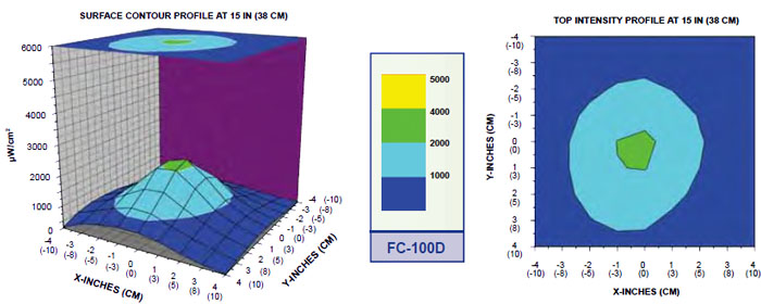- 超高強(qiáng)度 15”距離(38cm),標(biāo)準(zhǔn)型號FC-100紫外強(qiáng)度達(dá)5000µW/cm² ,配散光濾色片的FC-100D紫外強(qiáng)度達(dá)2200µW/cm²。