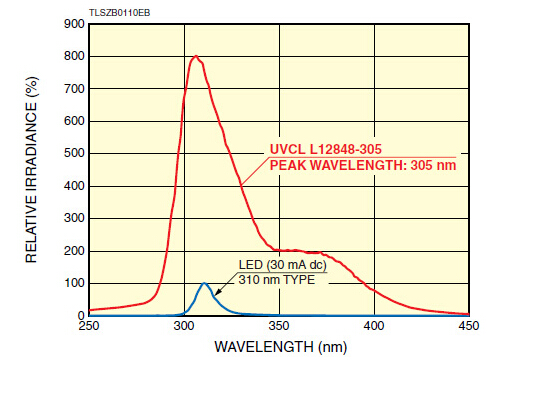 高亮度:約在紫外LED的8倍(310nm)
