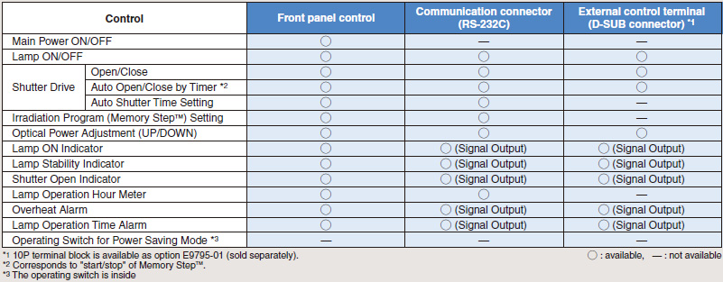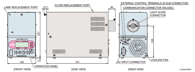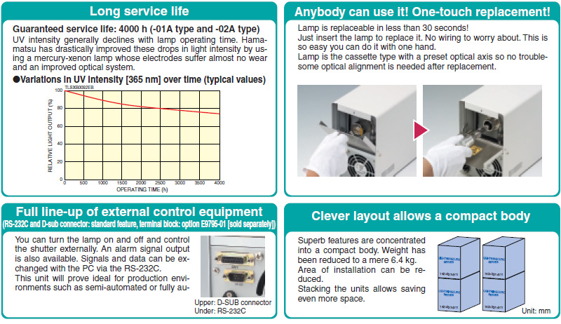 點(diǎn)光源采用長壽命高光強(qiáng)的汞氙燈和光損耗小化的光學(xué)系統(tǒng)。我們的紫外點(diǎn)光源因長壽命和高功率而獲得良好的聲譽(yù),正在各種領(lǐng)域扮演著重要角色,尤其是FA(工廠自動化)。紫外點(diǎn)光源產(chǎn)生更少的熱量,因此能理想用于易熱損的微元件和光學(xué)元件的粘結(jié)時的紫外固化。[光導(dǎo)插口:背面,燈管更換位置:操作面板(前面)]
